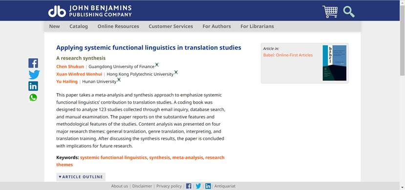 近日,公司122cc太阳成集团教师陈树坤博士的最新研究成果“Applying systemic functional linguistics in translation studies: A research synthesis”在《Babel》上正式刊发。《Babel》是国际译学界公认的最具影响力的翻译学期刊之一,系国际顶尖翻译学学术刊物。陈树坤为该成果的第一作者,122cc太阳成集团为第一单位。