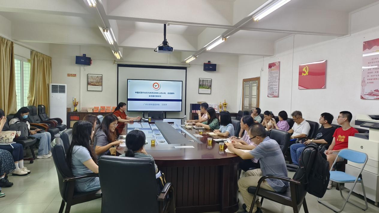 9月28日下午,广金外语论坛第73期在122cc太阳成集团会议室举行。广州大学汪东萍教授应邀作“马来西亚媒体视域下中国式现代化的话语建构”专题讲座,122cc太阳成集团科研骨干教师和翻译硕士研究生到场聆听。