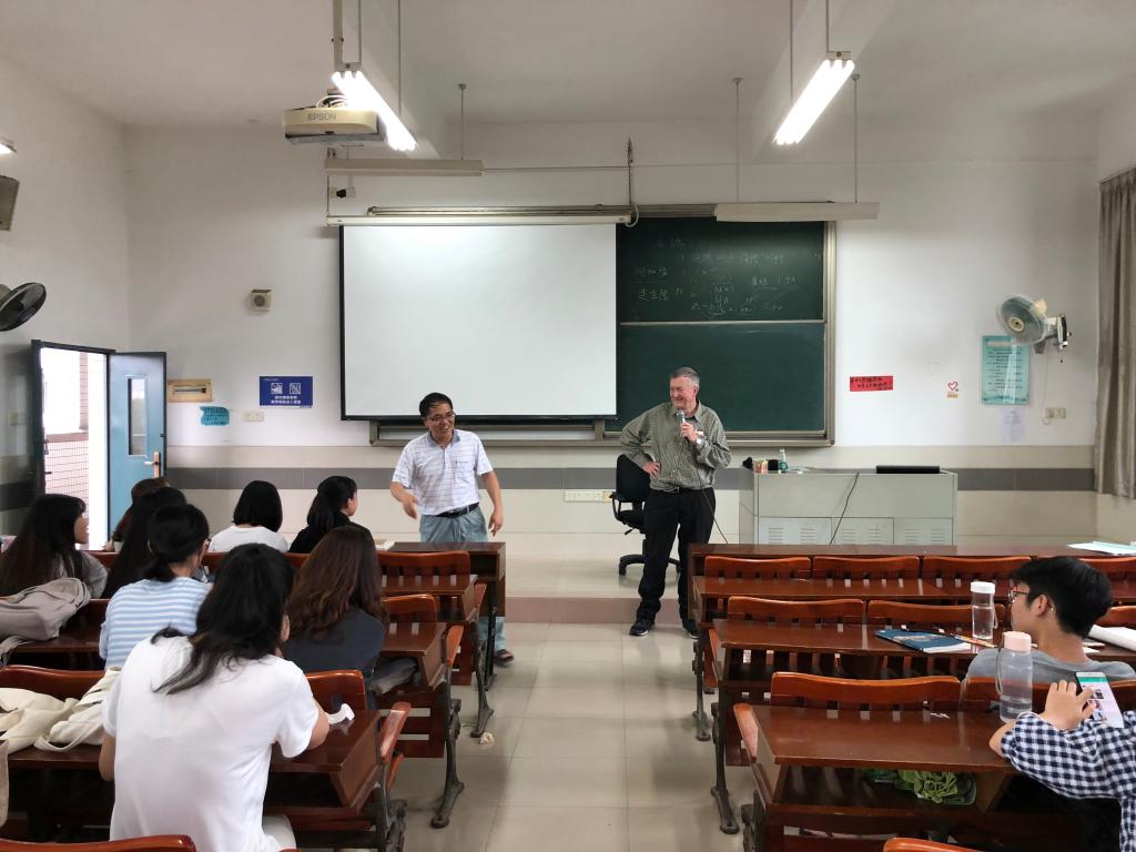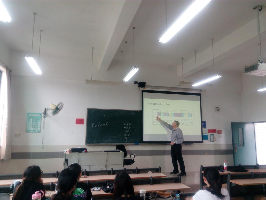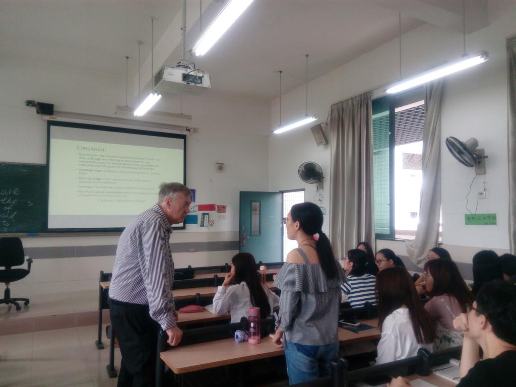 2018年6月12-14日,在与122cc太阳成集团教师进行“海外名师讲座”学术交流之余,公司还安排词典学名家、南非比勒陀利亚大学(University of Pretoria)语言学Prinsloo教授分别到公司1515951、1515952和1515953三个班的“英语论文写作”课上,让公司英语专业老员工在教室里,面对面与海外名师交流;让老师给员工答疑解惑。