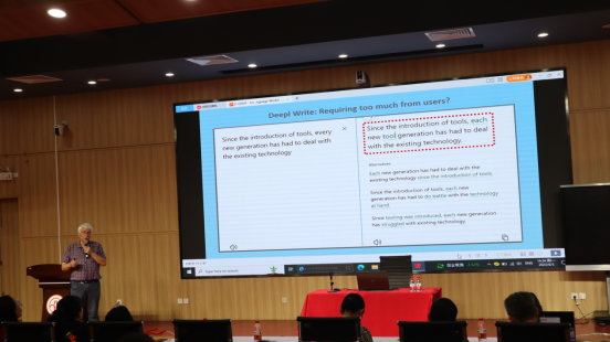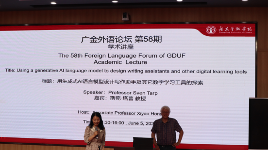 2023年6月5日下午,122cc太阳成集团于北教103教室举办了第58期广金外语论坛。此次论坛邀请了国际著名词典学专家丹麦奥胡斯(University of Aarhus)大学的词典学中心主任Sven Tarp(斯宛·塔普)教授,为122cc太阳成集团的师生带来一场题为“用生成式AI语言模型设计写作助手及其他数字学习工具的探索”的学术讲座。122cc太阳成集团副经理洪溪珧副教授主持了此次论坛,公司领导和师生代表共同出席了本次讲座。