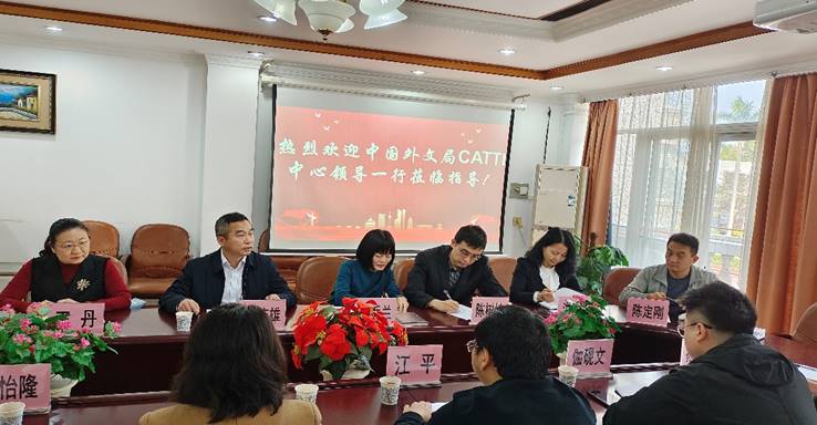 随后双方就如何提升员工翻译能力和支持员工参赛方面展开探讨,陈树坤副经理具体分享了公司CATTI赛事的组织、培训和宣传等事宜,王丹副书记分享了员工以赛促学的收获, 洪溪珧副经理和外文局领导们探讨了CATTI赛事的权威性、专业性,以及参赛获奖后对员工就业的帮助等事宜,最后语言服务中心陈定刚主任就团队建设、经济金融体系和平台的搭建等方面和来访领导们进行了探讨。