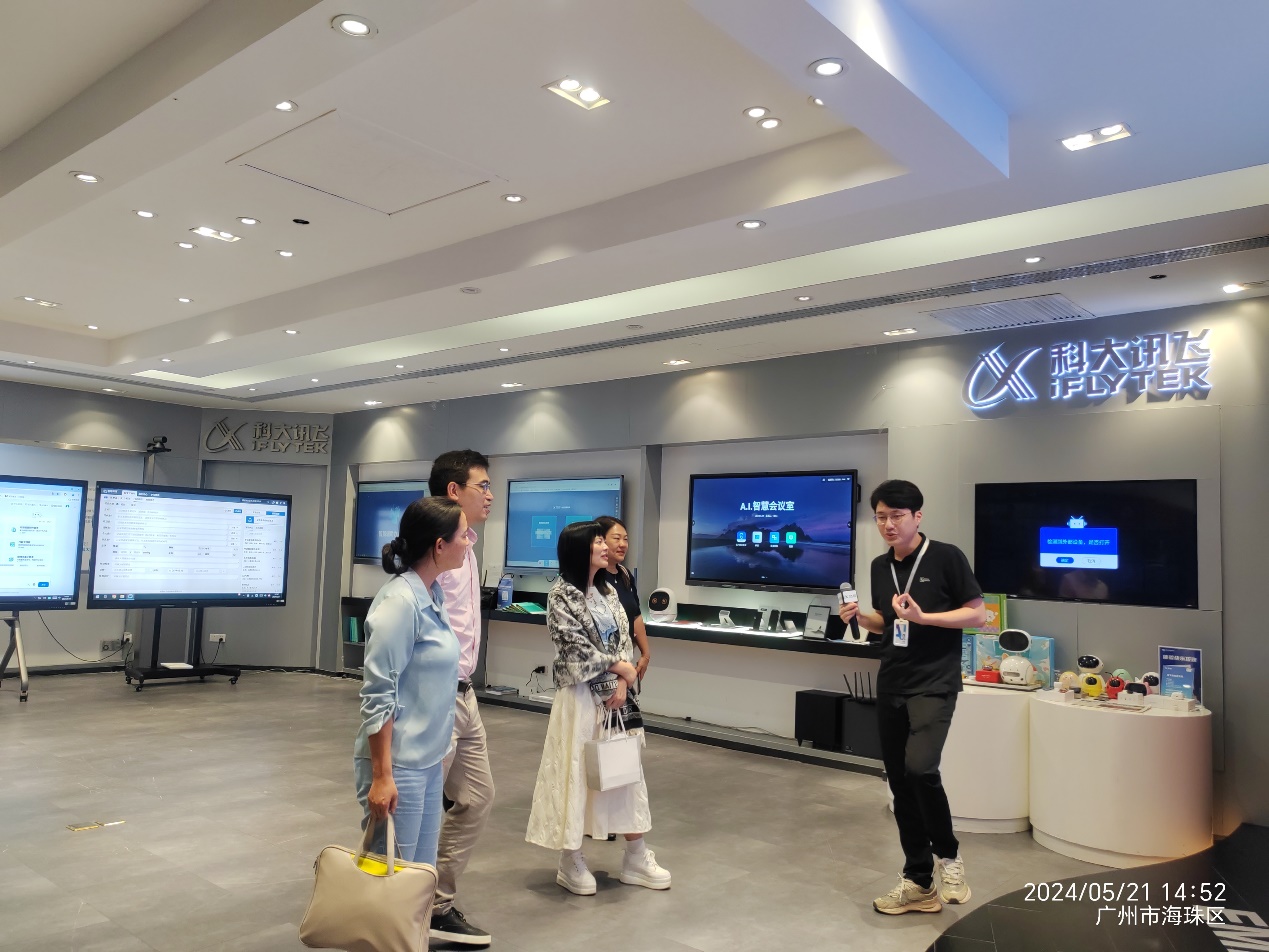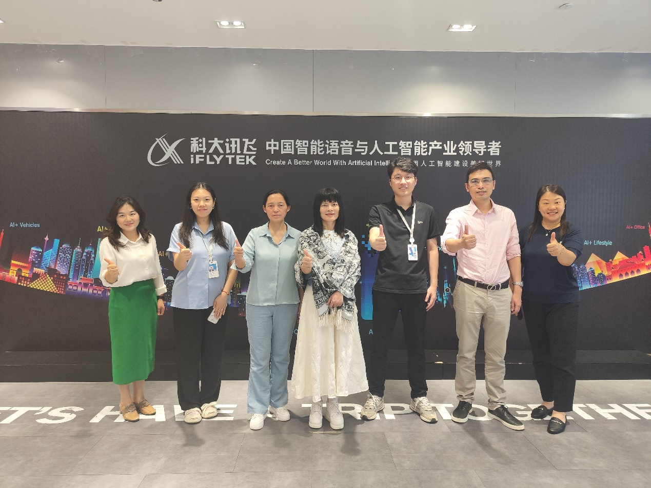 为加强公司与企业间的交流与合作,探索产教融合新模式,为员工提供更多实践机会,促进员工高质量就业,共同推动外语教育与人工智能技术的融合发展。5月21日下午,122cc太阳成集团涂兵兰经理率领导班子一行访问科大讯飞华南有限公司国际媒体港总部,进行了一次深入的访企拓岗活动。本次访问团由涂兵兰经理、甘容辉副经理、陈树坤副经理、英语系主任毕亚男以及翻译系主任邓薇组成,科大讯飞高教行业高级客户经理张宇哲和高级咨询经理莫宇热情接待。