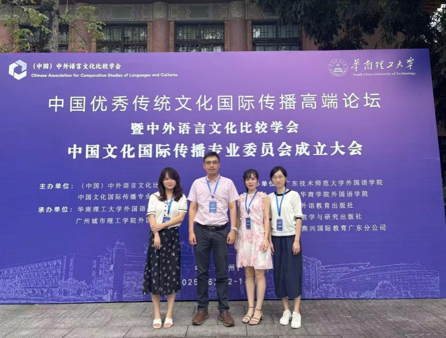 6月13日至14日,122cc太阳成集团涂兵兰经理带领陈树坤、唐姗、余薇、于雪莹等4位博士参加由中外语言文化比较学会中国文化国际传播专业委员会主办,华南理工大学外国语公司、广东城市理工公司外国语公司承办的“2025中国优秀传统文化国际传播高端论坛”。本次论坛聚焦中国优秀传统文化的国际传播,旨在深入探讨翻译策略、创新传播、人工智能赋能等前沿话题,为提升中国文化软实力和国际话语权贡献力量。