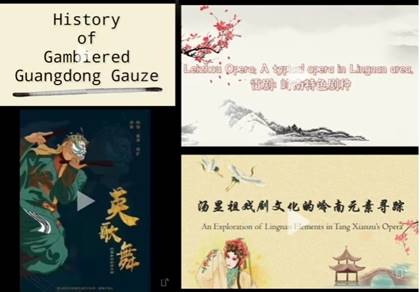 雷厉风行剧神队制作了《雷剧:岭南特色剧种》微视频,发表《暑期三下乡|雷厉风行剧神队》《雷剧|艺术家介绍及访谈》和《雷剧|岭南文化特色研究》3篇推文;徐闻寻迹汤显祖戏剧艺术队制作了《汤显祖戏剧文化的岭南元素寻踪》微视频,发表《暑期三下乡|徐闻寻迹汤显祖戏剧艺术队》《探寻汤显祖的岭南行踪》《师生共译汤显祖岭南诗歌》《汤显祖贵生思想》《岭南文化对汤显祖戏剧的影响》共5篇推文;佛山香云纱调研队制作了《香云纱的前世今生》微视频,并发表《暑期三下乡|香云纱的前世今生》推文;因歌队制作了《潮汕舞团魅力英歌》微视频,发表了《英歌之美舞动人心|三下乡社会实践活动》、《英歌舞》2篇推文;新时代文明实践团则通过采访知名粤剧家吴非凡女士,感受粤剧在红色传承中的融合发展,并发表粤剧“三下乡”社会实践活动总结推文,对粤剧这一岭南艺术瑰宝进行宣传译介。