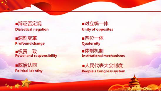 会议还对思政词汇翻译问答开展互动环节。陈树坤博士提问了诸如思想政治教育(Ideological and Political Education)、革命批判精神(Revolutionary Critical Spirit)、辩证唯物主义(The Dialectic Materialism)、权责一致(Power and Responsibility)、政治认同(Political Identity)、人民代表大会制度(People's Congress System)、对立统一体(Unity of Opposites)等思政词汇,各组成员迅速反应,积极抢答,充分展现了外文学子敏学笃行的精神。