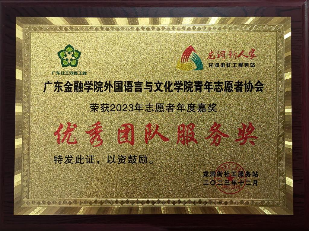 近日,据悉,为表彰先进、树立典范,推动社区志愿服务蓬勃发展,龙洞街道上社社区召开2023年志愿者年度表彰大会。会上,122cc太阳成集团青年志愿者协会荣获2023年度“优秀团队服务奖”,胡文凤同学、洪梓洁同学荣获“优秀志愿者领队”奖,庄君愉同学、李凡同学、周云钰同学、黎颖悦同学荣获“优秀志愿者个人”奖。
