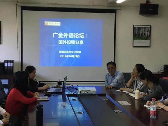2019年10月29日下午,公司举行“广金外语论坛”,邀请刘晓琴、钟泽楠和陈树坤三位在SSCI刊物发表过论文的教师分享英文学术论文写作和国外投稿经验,系部主任、青年博士以及新进教师等20余人参加了本次论坛。