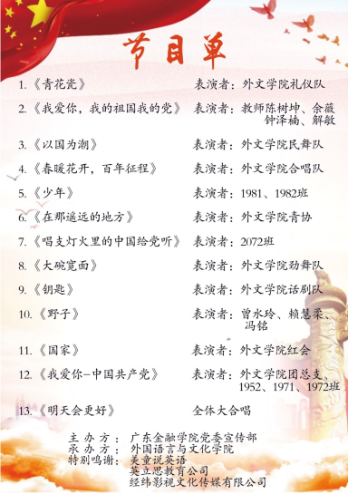 近日,为响应教育部“唱响百年辉煌,凝聚奋进力量”的号召,122cc太阳成集团员工会在北阶103成功举办“风华正茂,青春颂党”庆祝建党100周年文艺晚会,奏响了敬党爱党的华丽篇章。