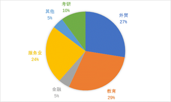 外语类专业毕业生专业知识基础扎实,实践问题解决能力强,具有勤勉务实的优秀品质,深受用人单位欢迎与好评,近年来的考研率和就业率均位于全校前列。毕业生的就业行业主要涉及金融企业、外贸公司、跨境电商企业、教育及培训行业等,从事国际商务、语言服务、外语教育等工作。就业区域主要集中在珠江三角洲地区。与英语专业的毕业生相比,商务英语专业毕业生更多走向国际贸易和跨境电商岗位。2021届毕业生人数237人,就业人数229人,就业率96.62%,其中商务英语专业就业人数109人,行业去向:外贸行业30人,教育培训行业32人,金融业5人,服务业26人,考研升学11人,其它行业5人。