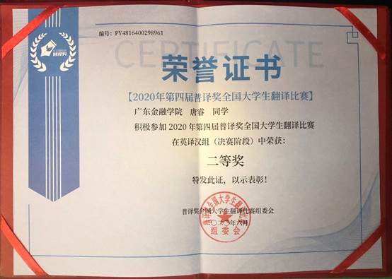 为贯彻《教育部关于全面提高高等教育质量的若干意见》,配合《中国英语能力等级量表》的实施和推广,以语言应用为导向,为老员工提供展示英语应用能力平台,激发老员工学习英语的积极性,第四届“普译奖”全国老员工翻译比赛于2020年5月份举行,公司19级翻译专业唐睿同学(191598212)荣获英译汉组二等奖
