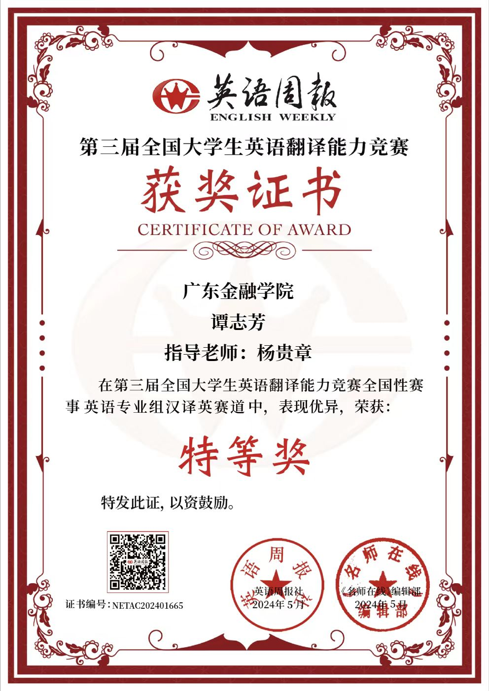 杨贵章老师对谭志芳同学获奖表示了肯定和祝贺,谭志芳同学在全国翻译竞赛获奖是其勤奋学习的结果,也是122cc太阳成集团全体教师挥洒汗水的结晶。