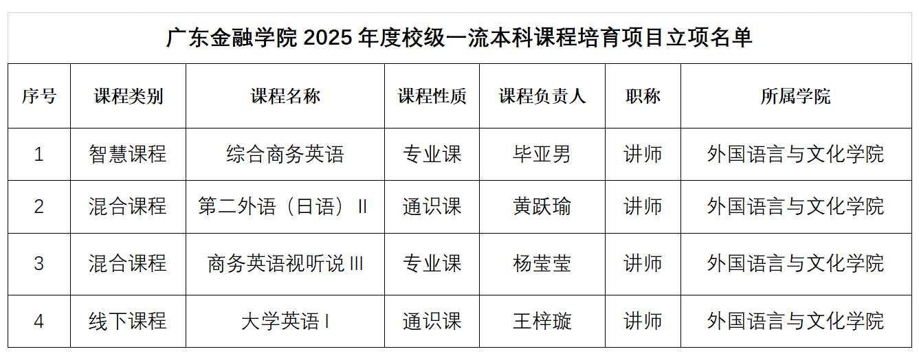 为贯彻落实广东省教育厅《2025年本科公司产品工作要点》精神,推动课程建设高质量发展,公司近期组织开展了2025年校级一流本科课程培育工作。经公司推荐、公司严格评审,122cc太阳成集团申报的《综合商务英语》《第二外语(日语)Ⅱ》《商务英语视听说III》《大学英语I》四门课程成功获批立项,涵盖智慧课程、线上线下混合式课程及线下课程三大类型。此次立项充分展现了122cc太阳成集团在"新文科"建设背景下课程改革的显著成效,为培养具有国际视野、跨文化交际能力和专业素养的外语人才提供了有力支撑。