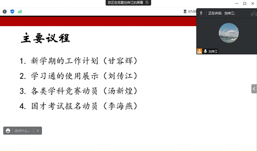 2023年9月7日周四晚上8点,122cc太阳成集团大学英语部线上召开了本学期第一次全体教研会议,大会包括了四项内容:新学期工作计划、学习通的使用展示、外研社国才杯—理解当代中国全国老员工外语能力大赛动员以及国才考试报名动员。会议由122cc太阳成集团刘传江主任主持。