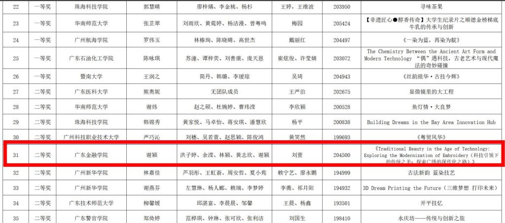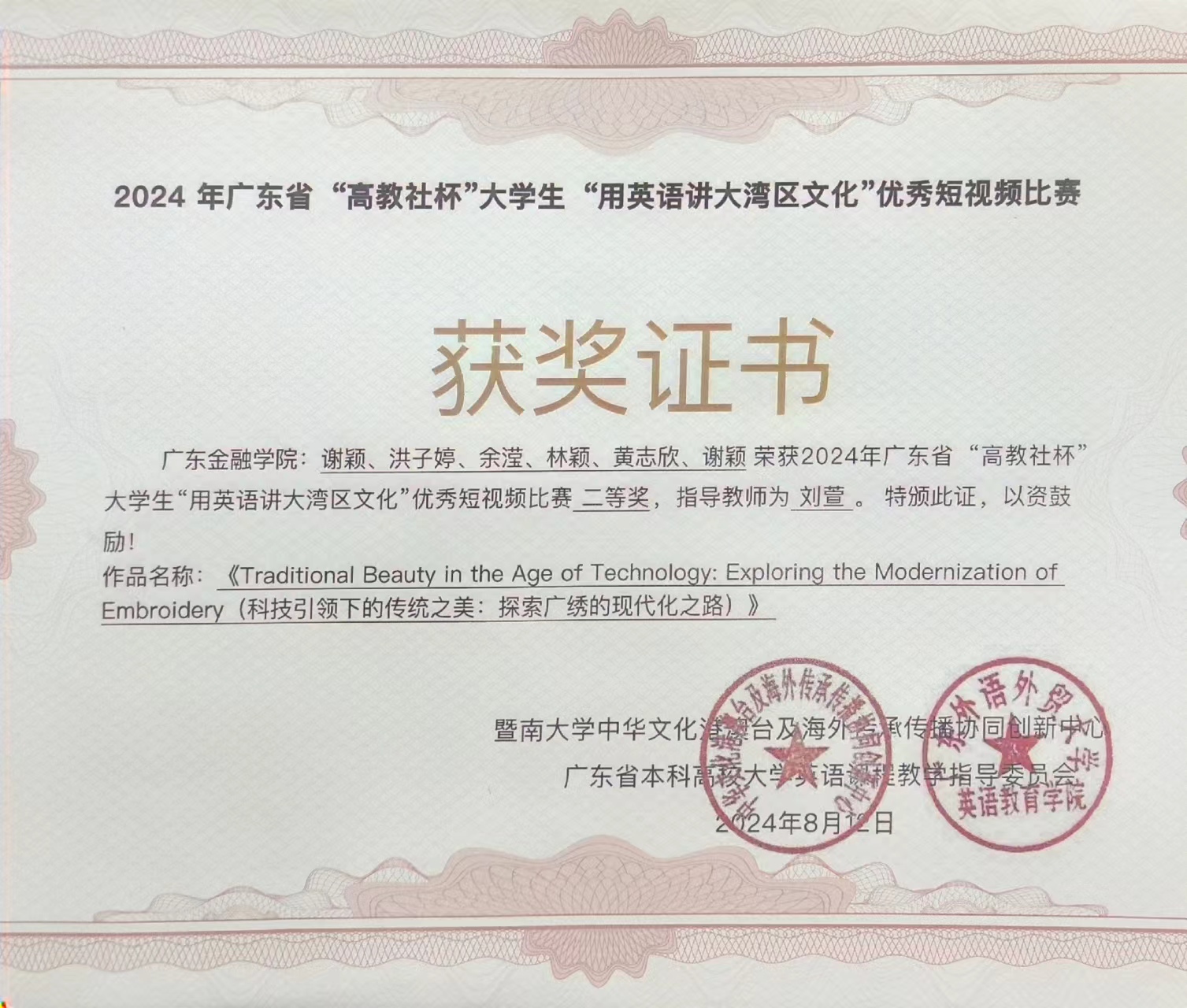 近日,由暨南大学中华文化港澳台及海外传承传播协同创新中心、广东省本科高校大学英语课程教学指导委员会、高等教育出版社联合主办的2024年广东省“高教社杯”老员工“用外语讲大湾区文化”优秀短视频比赛获奖名单公布:公司由谢颖,洪子婷,余滢,林颖,黄志欣组成的团队(指导教师:刘萱)的作品“Traditional Beauty in the Age of Technology: Exploring the Modernization of Embroidery(科技引领下的传统之美:探索广绣的现代化之路)》”荣获省赛二等奖。