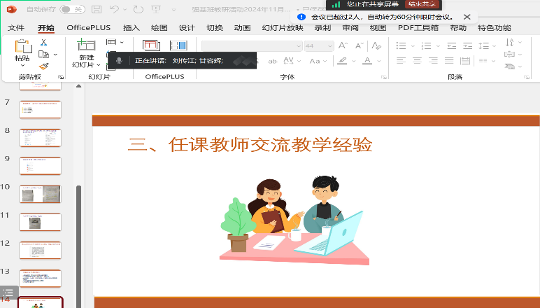 在随后的任课教师教学经验分享环节,任课教师们踊跃发言,分享了各自的教学实践经验。他们通过集体备课、共同制作课件,确保了教学内容的科学性和系统性。为帮助员工掌握图表作文技巧,教师们还精心准备了纸质和数字版资料供员工背诵记忆。同时,老师们利用学习通、QQ群等平台,分享了大量学习资源,特别是往年的真题及解析,为员工备考提供了有力支撑。此外,教师们还通过发布时事新闻词汇测试、批改网布置作文等方式,开展智慧教学与管理。