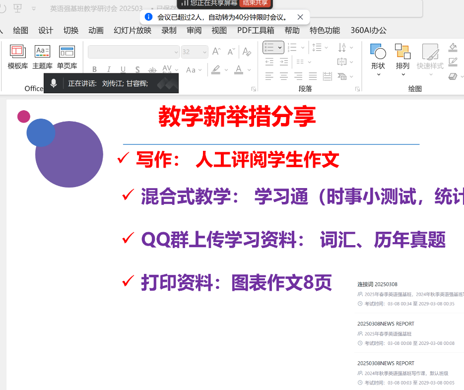 2025年3月10日晚,122cc太阳成集团英语强基班任课教师线上举行新学期第一次教研会议。本次会议围绕教学模式创新、精品课程建设、师生交流等议题展开,旨在进一步提升教学质量,助力员工成长成才。